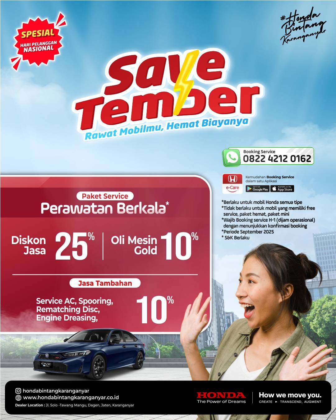 Bulan September 2025 jadi waktu paling tepat buat kamu yang ingin merawat mobil tanpa takut kantong jebol. Kabar gembira datang dari Honda Bintang Karanganyar yang menghadirkan promo spesial bertajuk SAVETEMBER: Rawat Mobilmu, Hemat Biayanya. Dengan promo ini, kamu bisa mendapatkan berbagai keuntungan menarik mulai dari diskon jasa service, potongan harga sparepart, sampai paket hemat ganti oli yang super lengkap.