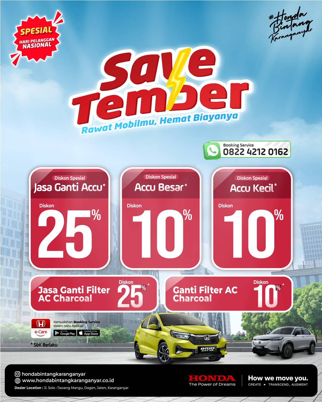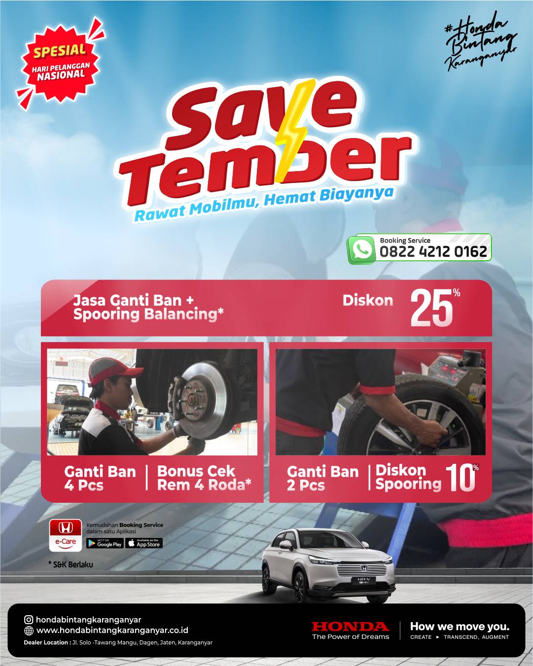 Merawat mobil secara rutin adalah kunci agar performanya tetap maksimal. Dalam promo SAVETEMBER ini, Honda Bintang Karanganyar memberikan penawaran luar biasa: