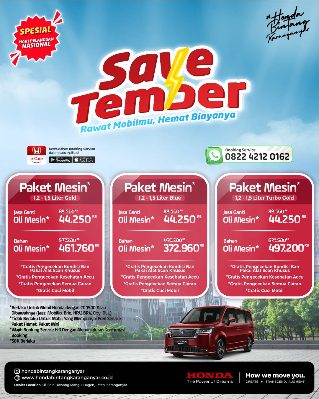 Honda selalu tahu kebutuhan para pelanggan setianya. Bukan hanya fokus pada penjualan mobil baru, tapi juga menghadirkan layanan purna jual terbaik dengan harga yang bersahabat. Melalui promo SAVETEMBER, Honda Bintang Karanganyar ingin memastikan mobil kesayanganmu tetap prima, aman, dan nyaman digunakan setiap hari.