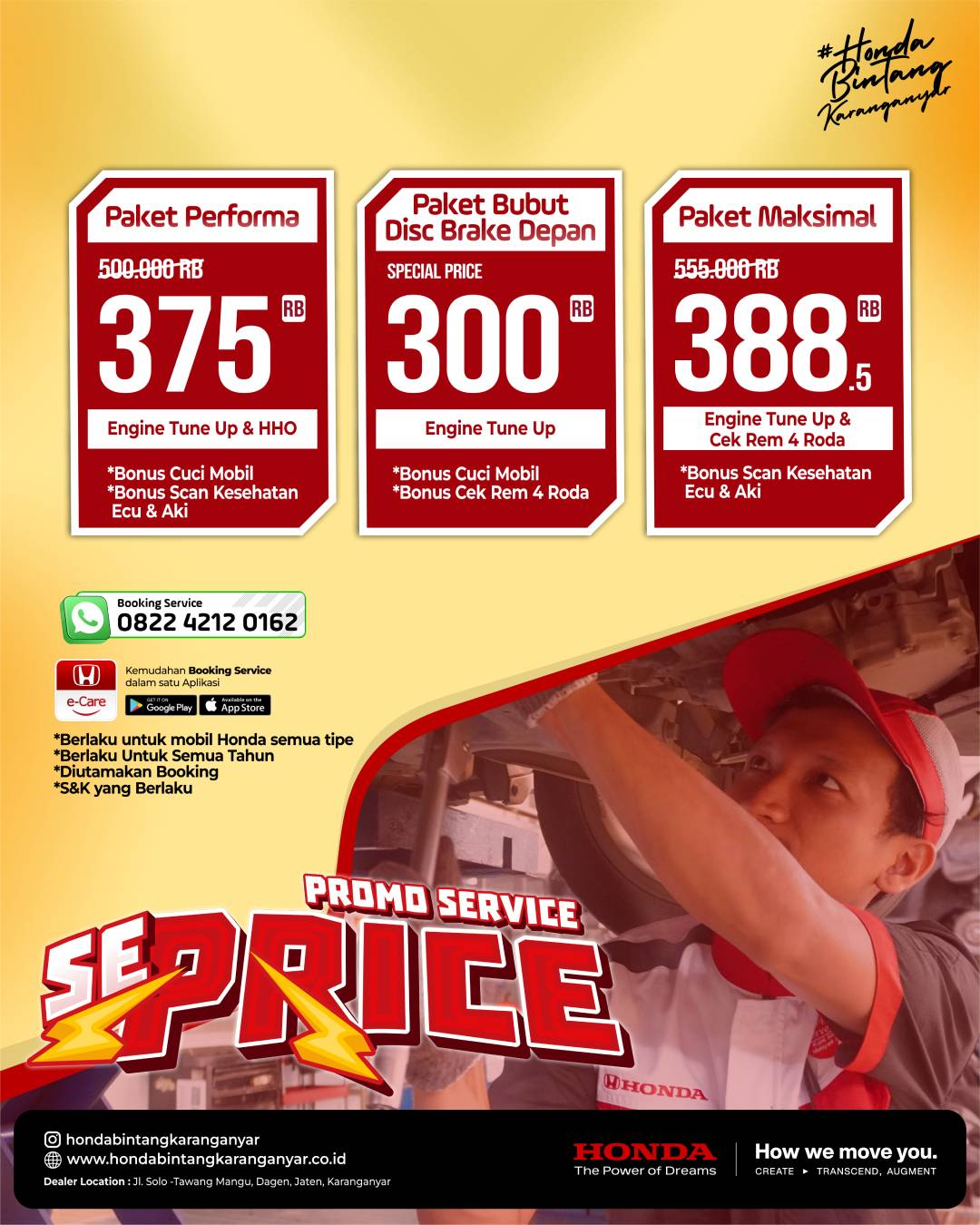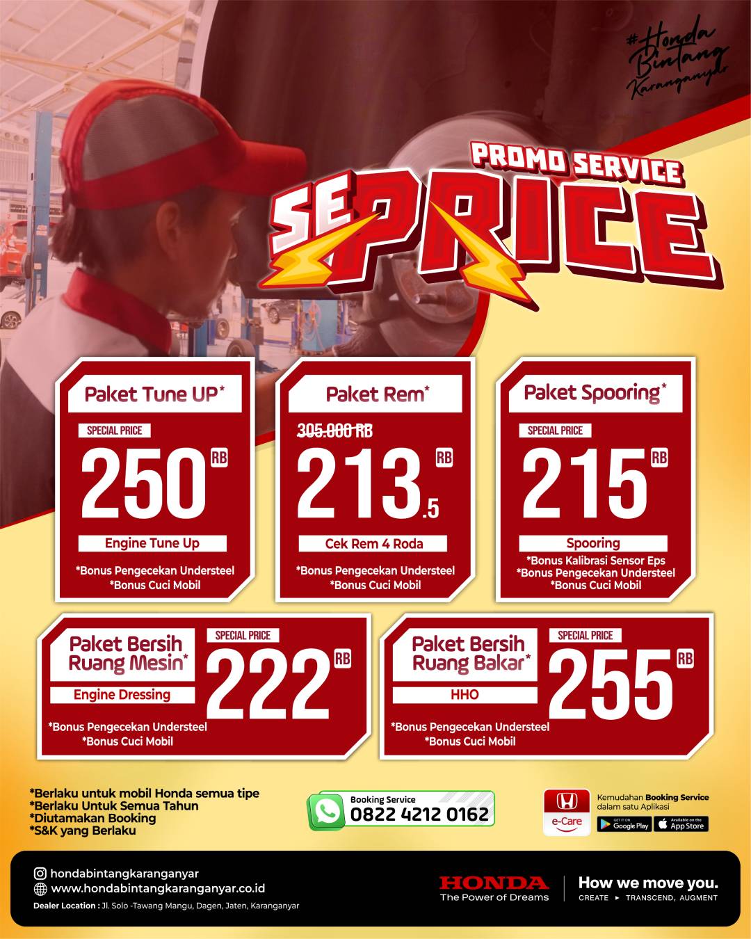 Bulan September 2025 ini, Honda Bintang Karanganyar kembali menghadirkan kabar gembira bagi para pemilik mobil Honda maupun non-Honda. Melalui promo SEPRICE Service, Anda bisa merawat kendaraan dengan biaya super hemat, layanan maksimal, dan bonus melimpah yang pastinya bikin pengalaman servis mobil semakin menyenangkan.