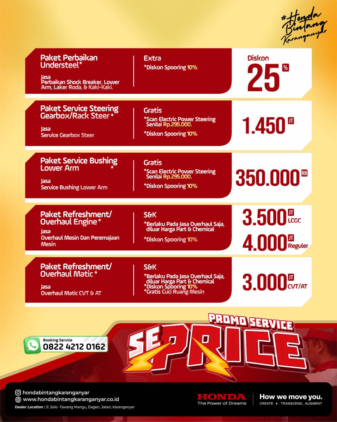 Selain paket utama, Honda Bintang Karanganyar juga memberikan penawaran eksklusif untuk perbaikan kaki-kaki dan steering.