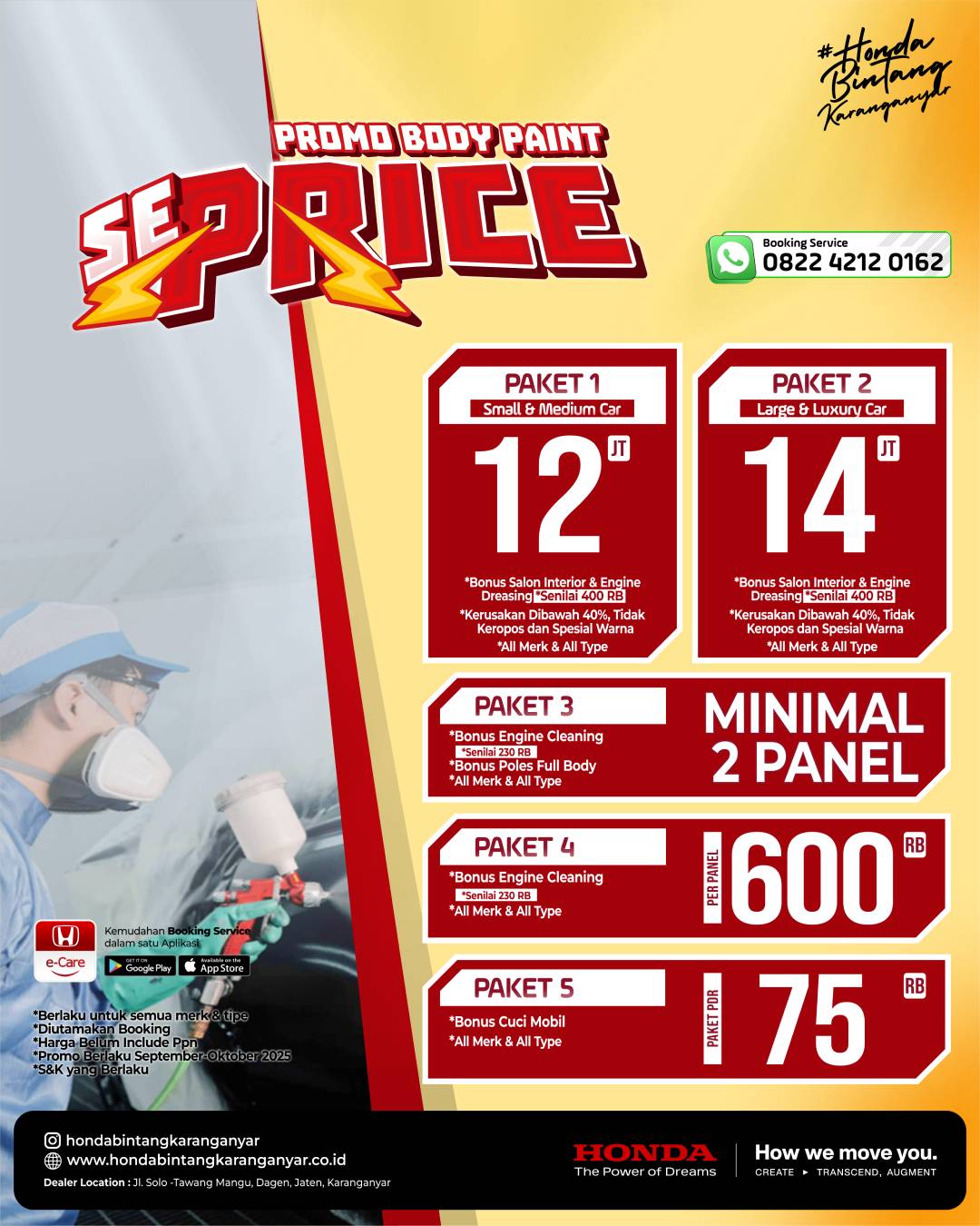 Semua paket promo SEPRICE Body Paint Honda Bintang Karanganyar berlaku khusus selama periode September 2025. Jangan lewatkan kesempatan emas ini, karena harga spesial dan bonus melimpah hanya tersedia untuk waktu terbatas.
