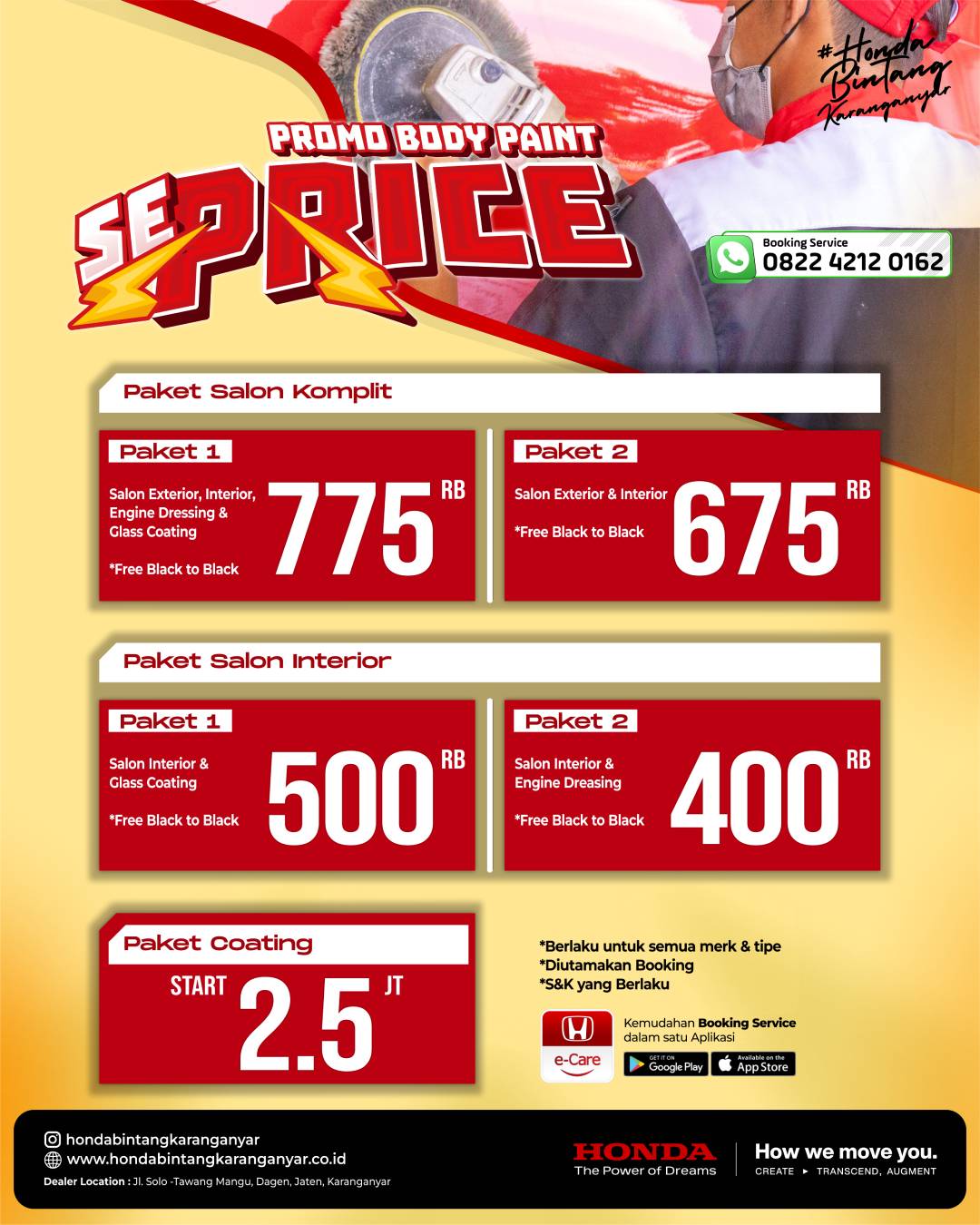 Mobil bukan sekadar alat transportasi, tapi juga cerminan gaya hidup dan kenyamanan Anda. Dengan mengikuti promo SEPRICE Body Paint di Honda Bintang Karanganyar, Anda bisa mendapatkan mobil yang lebih mulus, aman, nyaman, dan bernilai tinggi.